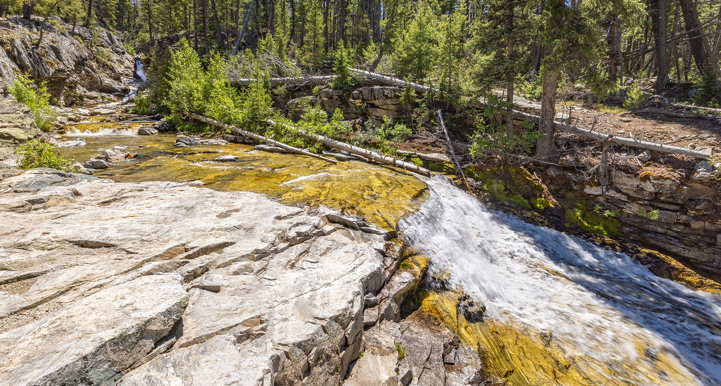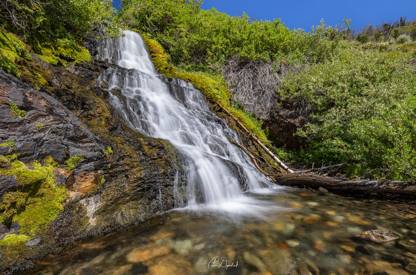 This first image was recently shot mid-day along Little Falls Creek in the Pioneer Mountains, Idaho. This small waterfall is one of many that I have photographed in the past but was not pleased with the results. For this shot I chose to cross the stream and shoot from the side instead of facing directly at the waterfall. The difference was night-and-day!
