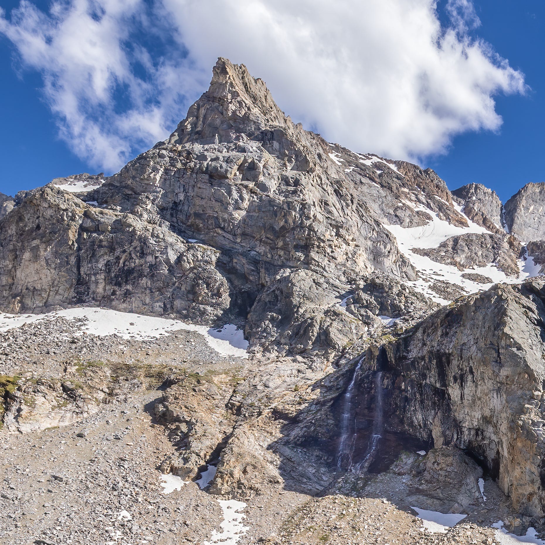 The sense of scale… here just a gentle waterfall cascading over the cliffs next to a towering peak creates the scale that has been missing from many of my previous shots. Even though the waterfall is not the central focus of the image, it adds a dimension to the photograph that really makes the grandeur of the scene stand out.